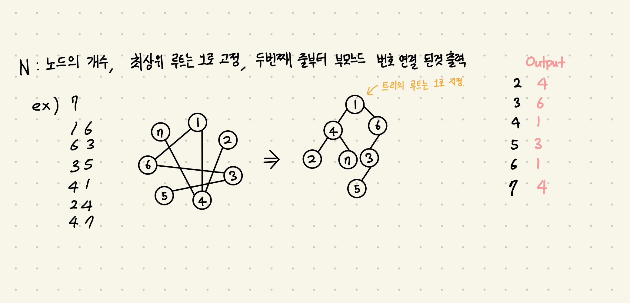 루트 없는 트리가 주어진다. 이때, 트리의 루트를 1이라고 정했을 때, 각 노드의 부모를 구하는 프로그램을 작성하시오.