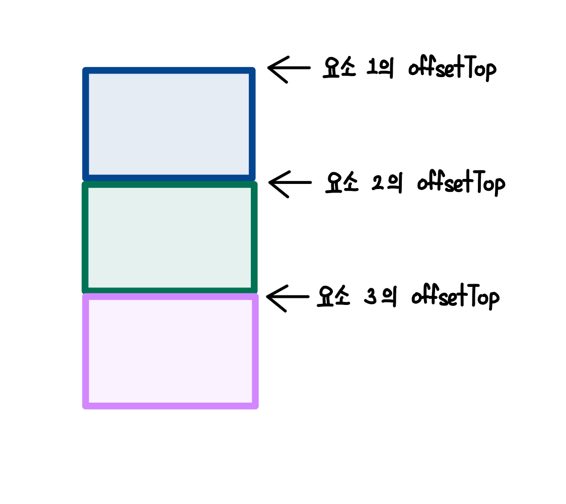 위 그림에서 요소 1,2,3이 화면에 표시되어있다고 할 때, 요소 1의 offsetTop이 위에서 가장 가까워 가장 낮은 수치를 가지고 있고