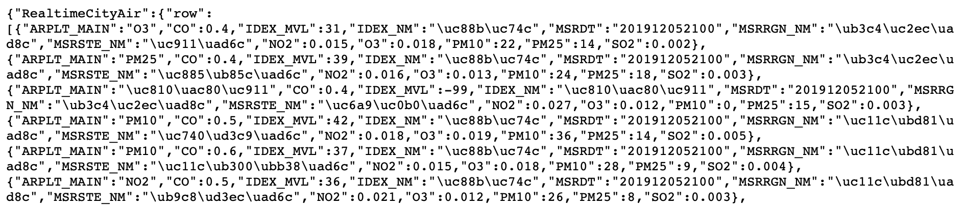 위의 미세먼지 Open API 링크로 들어가면 아래와 같은 데이터가 보인다. 하지만 아래의 데이터는 보기가 힘들다.