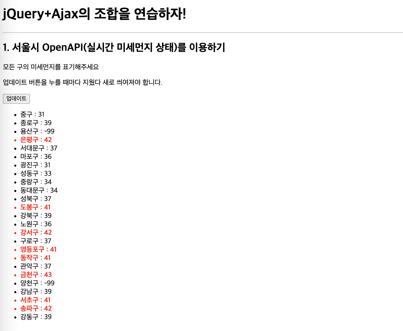 아래의 사진에서와 같이 업데이트 버튼을 누를 시 미세먼지의 수치가 40 이상은 위험으로 나타내기 위해 빨간색으로 표시되게끔 만들어야 한다.