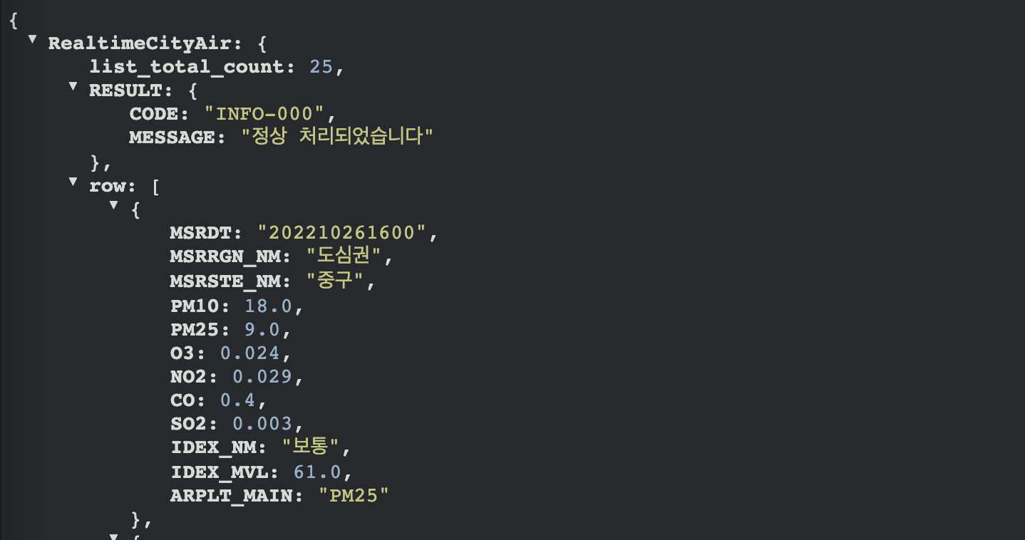 let rows = response["RealtimeCityAir"]["row"]; // 가져온 데이터에서 필요한 데이터만 뽑아내기