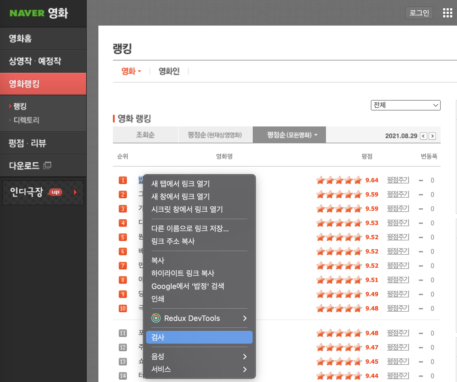 1. 네이버 영화 제목에서 우측 마우스를 클릭하여 '검사'를 누른다.