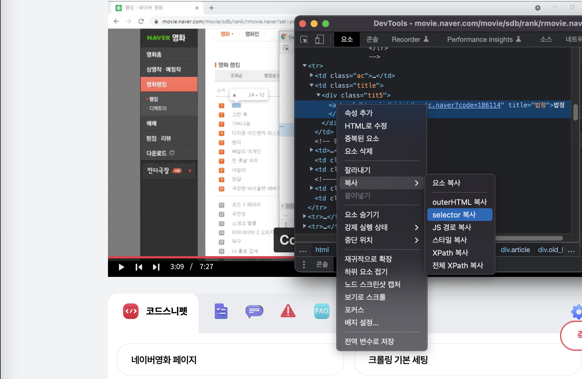 2. DevTools에서 영화 제목이 들어가 있는 링크를 우측 클리하여 '복사'->'selector 복사'를 선택한다.