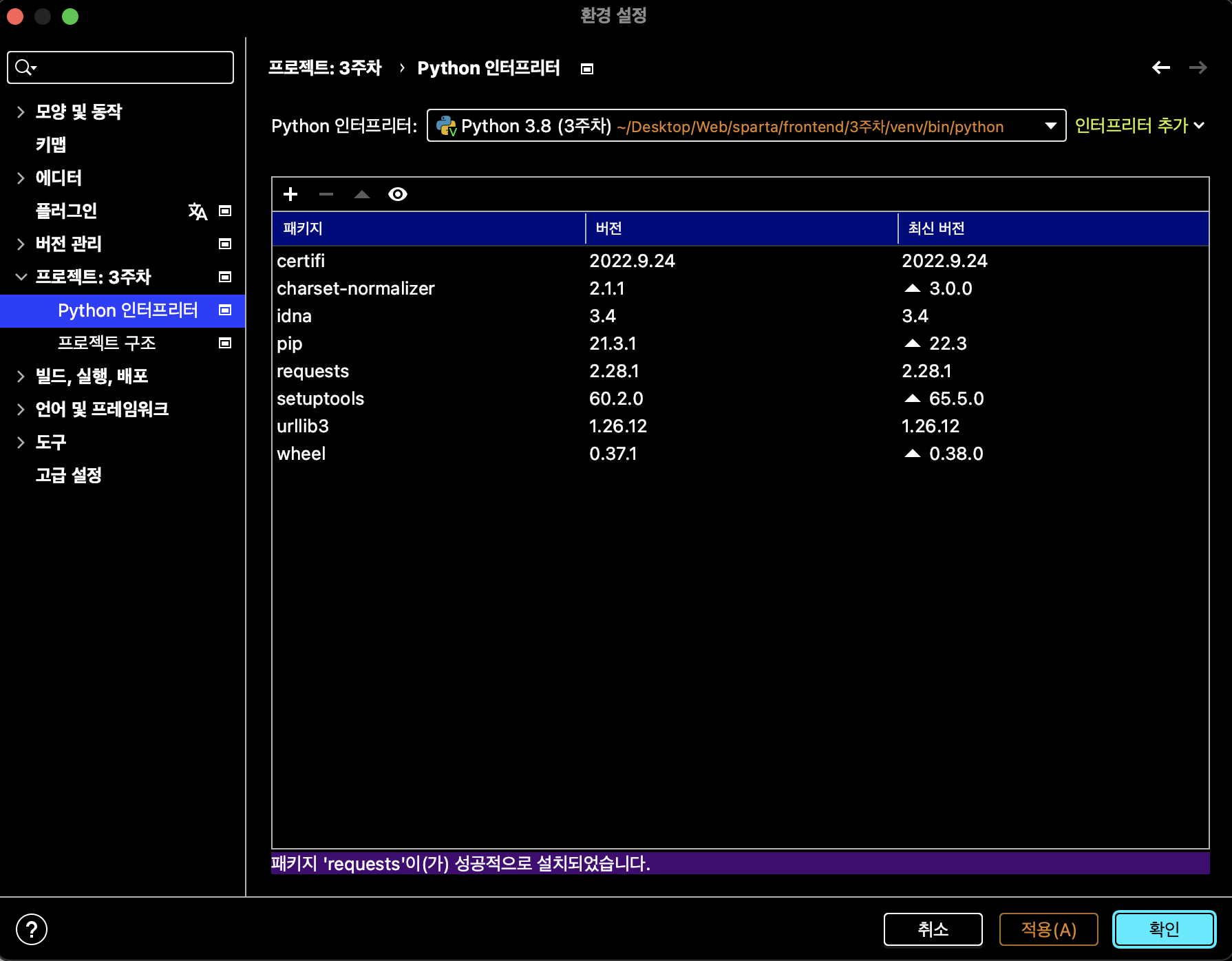 (requests설치와 비슷하여 사진 첨부는 하지 않았습니다.)