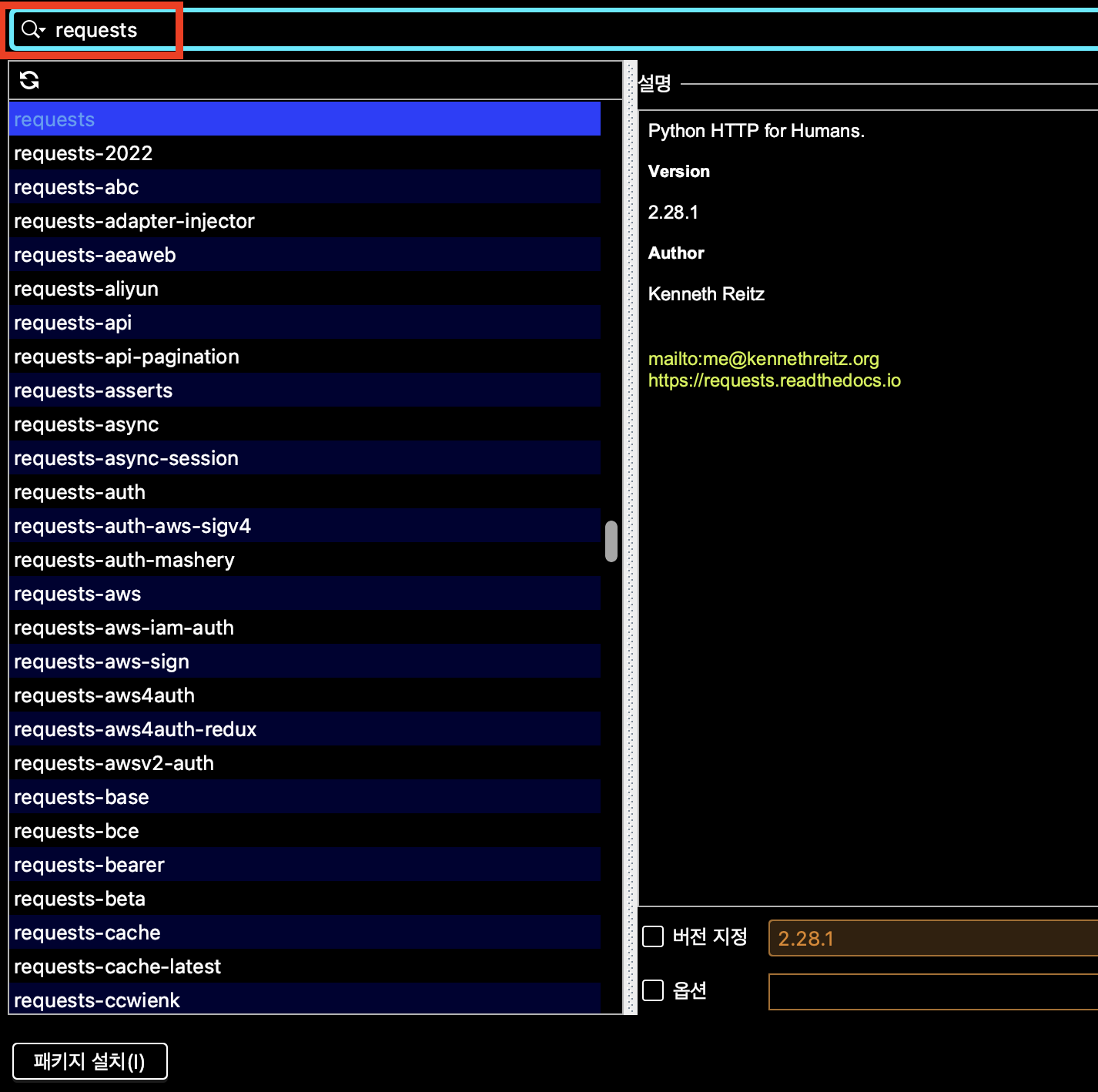 4. requests를 입력하고 하단에 '패키지 설치'를 누른다.