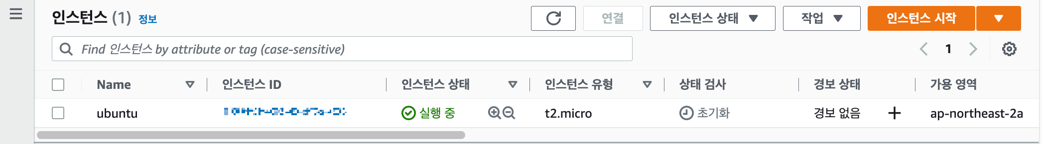 인스턴스를 만들고 조금 기다리면 인스턴스 상태가 아래와 같이 실행 중으로 변한다.