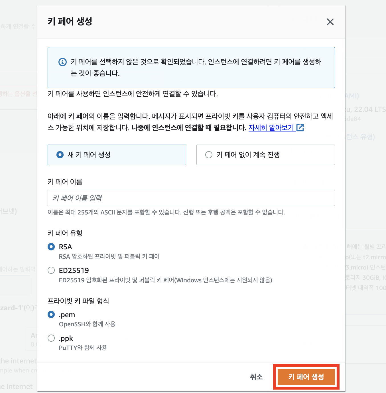 기본으로 설정되어있는 거 그대로 키 패어 생성을 누른다.
