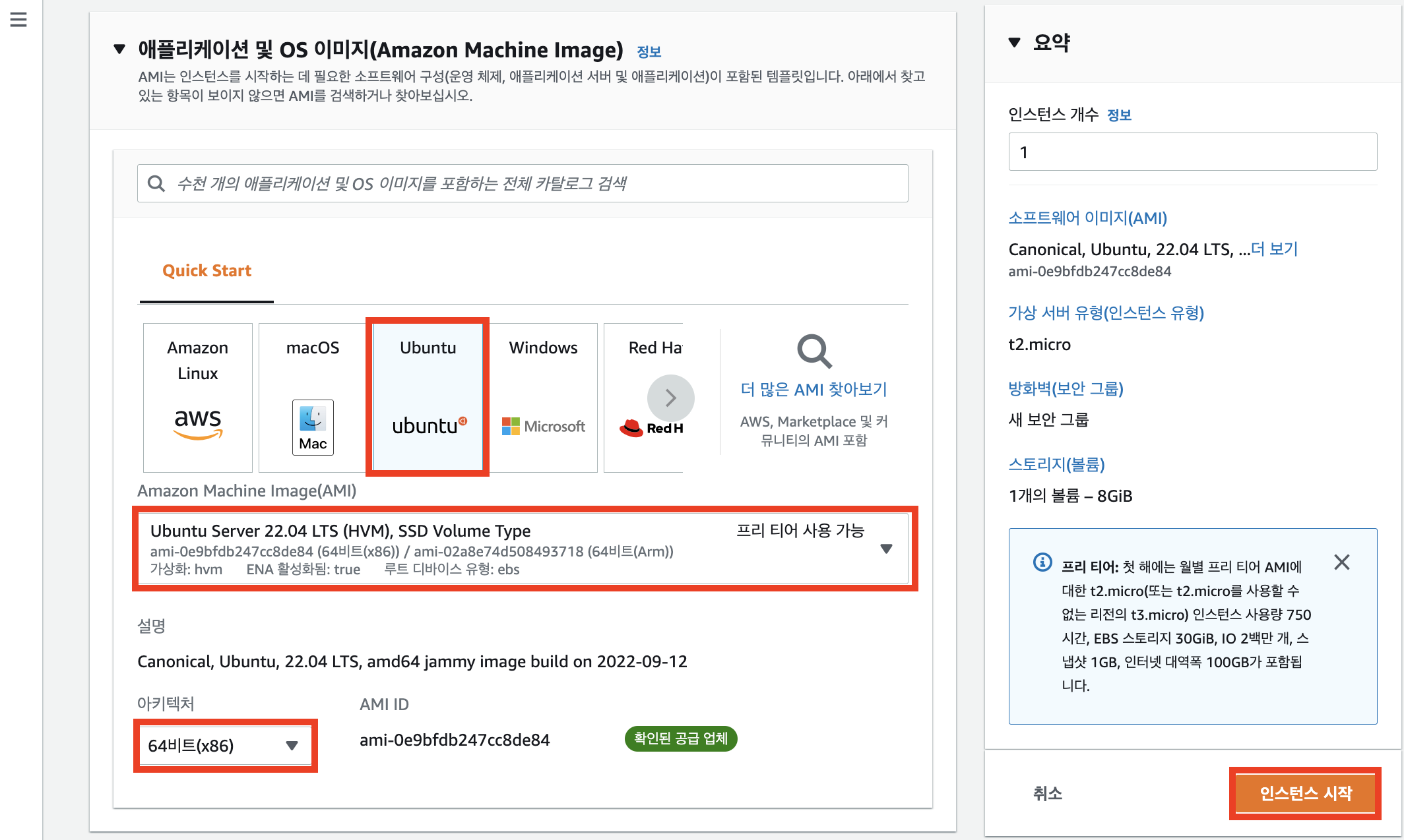 3. ubuntu 석택, Ubuntu Server 22.04 선택, 64비트(x86) 선택, 마지막에 인스턴스 시작 클릭