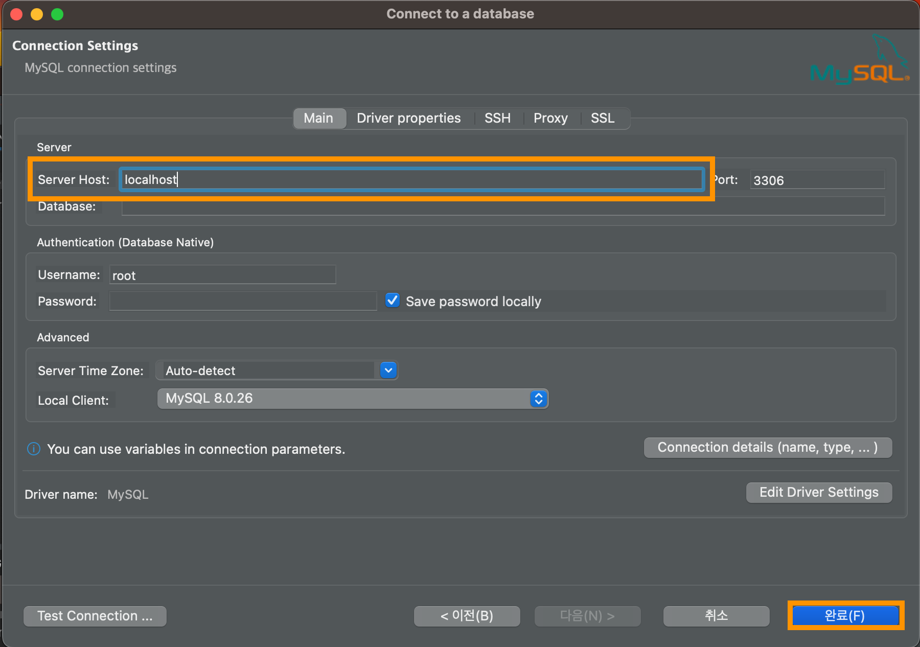 Connection Test 결과에 Connected 뜨면 확인 클릭. 마지막에 완료를 눌러준다.