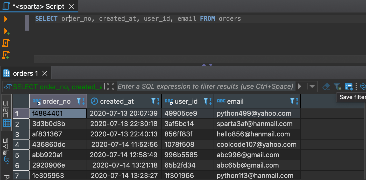 orders에서 order_no, created_at, user_id, email을 가져온다.