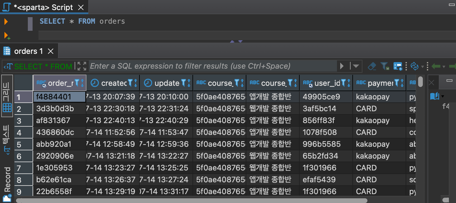 course_title이 앱개발 종합반일 때 payment_method가 CARD인 데이터를 출력한다.