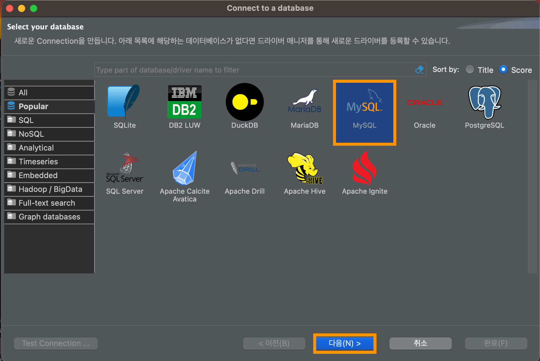 MySQL을 선택한 후 다음 클릭