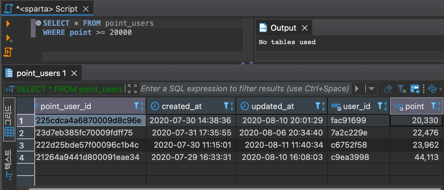 point가 20000보다 크거나 같은 point를 가진 user만 출력한다.