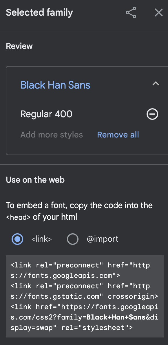 원하는 폰트를 선택한 후 link를 html 파일 <head> 태그 사이에 넣어준다.