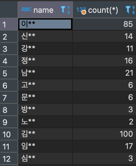 데이터 안에 이름의 성 별로 개수를 출력하기 위해서 먼저