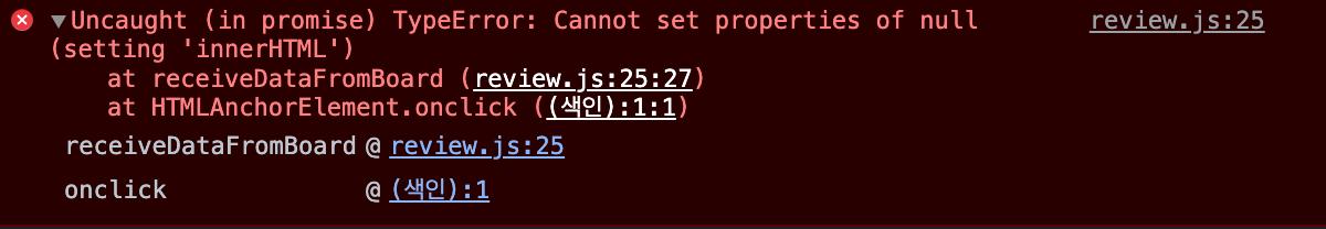 HTML이 렌더링이 되지 않았는데 자바스크립트가 먼저 동작해서 일어난 에러였다. 그래서 window.location.hash = '#review' 로 먼저 리뷰 페이지로 이동시켜준 뒤에 HTML 태그를 렌더링하는 receiveDataFromBoard() 함수가 실행시켜 주었다.