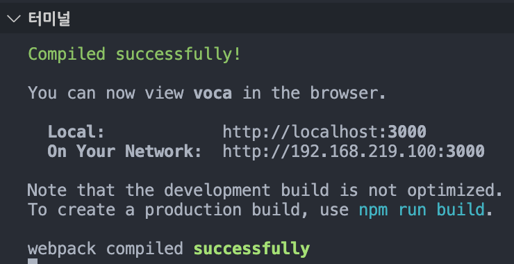 아래와 같이 문구가 뜨고 웹 창에 리액트 페이지가 켜진다.