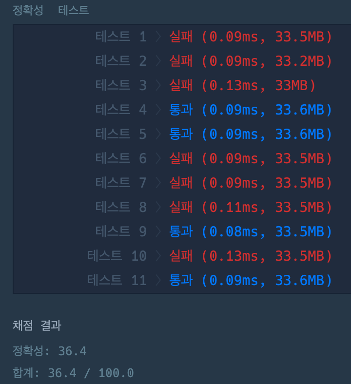 아래와 같이 풀었지만 무언가 잘못이 되었는지 테스트들이 통과가 되지 않는다...