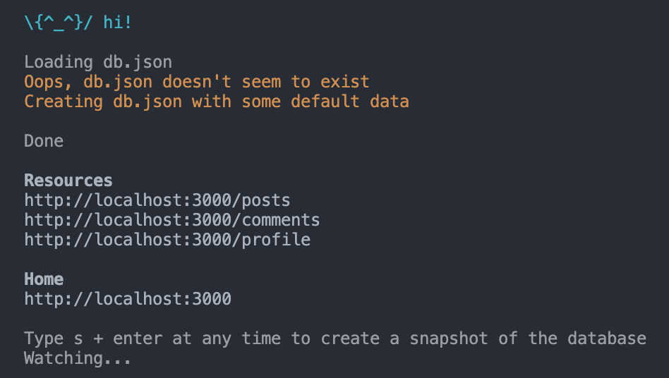 터미널에 아래와 같이 켜지면 json server이 켜졌다는 의미이다.