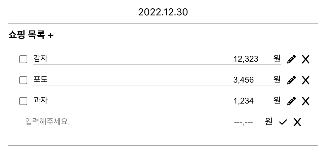 아래 이미지에서 연필(수정)을 누르면 입려한 가격을 수정 할 수 있다. 지금은 가격에 , (쉼표)가 출력 되지만 원래 출력이 되지않았다.