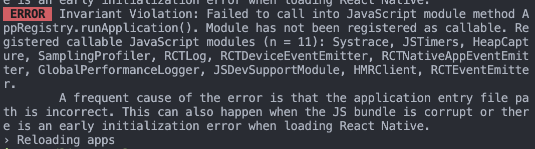 Invariant Violation: Failed to call into JavaScript module method AppRegistry.runApplication(). Module has not been registered as callable. Registered callable JavaScript modules (n = 11): Systrace, JSTimers, HeapCapture, SamplingProfiler, RCTLog, RCTDeviceEventEmitter, RCTNativeAppEventEmitter, GlobalPerformanceLogger, JSDevSupportModule, HMRClient, RCTEventEmitter.