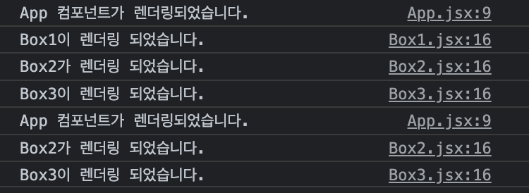 처음 렌더링 될 때는 모두 렌더링이 되고 '+'를 눌렀을 때 React.memo로 감싸진 Box1에서만 리렌더링이 일어나지 않았다.