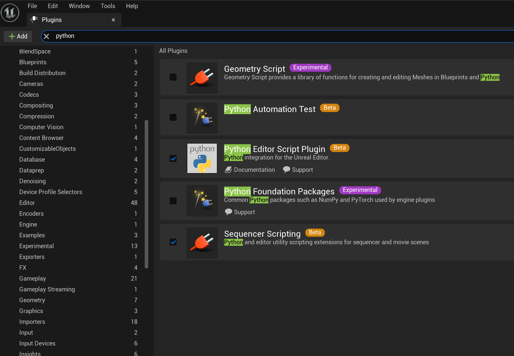 검색창에 'Python'을 검색한다. 'Python Editor Script Plugin'을 선택한다. 다시 시작 버튼을 눌러준다.