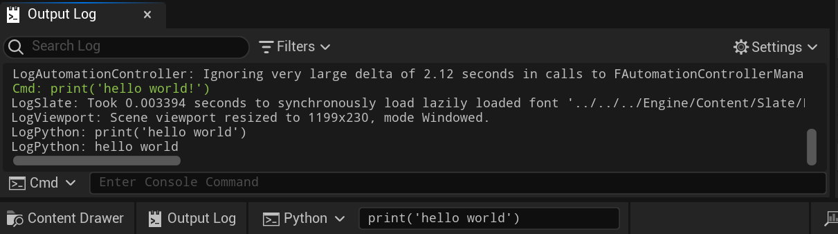 다음과 같이 print('hello world') 입력 후 Enter을 누르면 Output Log에 출력된다.