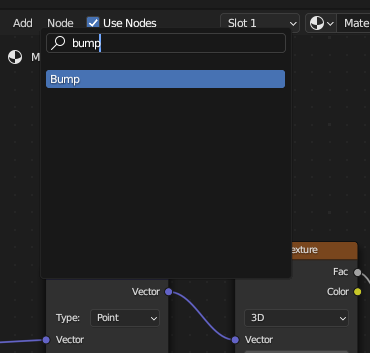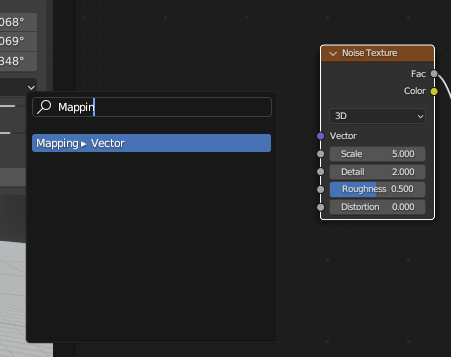 4. Noise Texture의 Vector을 끌어다가 빈 공간에 놓으면 아래와 같이 검색창이 뜨는데 Mapping->Vector을 선택해 준다.