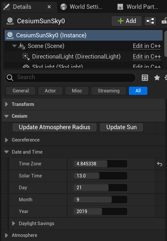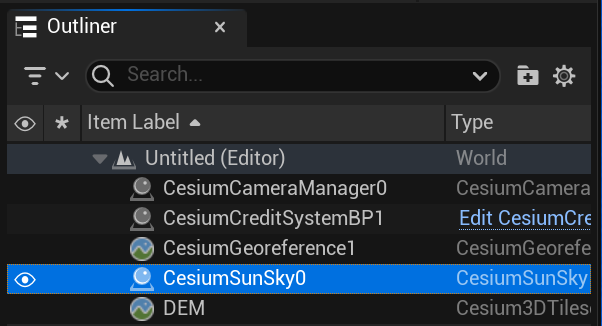 오른쪽 Outliner에 CesiumSumSky0이 생성된다.