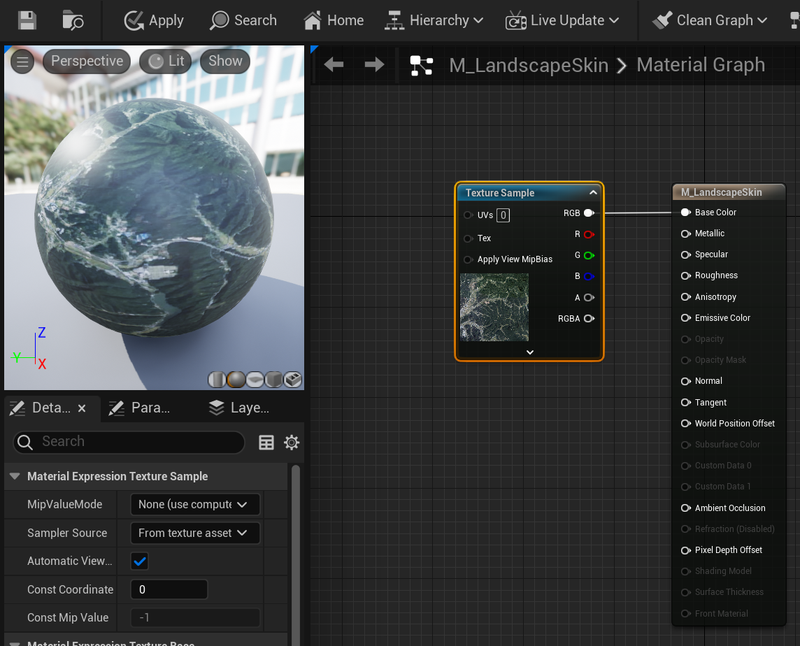 생성한 Texture을 위에서 연 창안에 끌어다 놓으면 아래와 같은 Texture Sample노드가 생성된다.