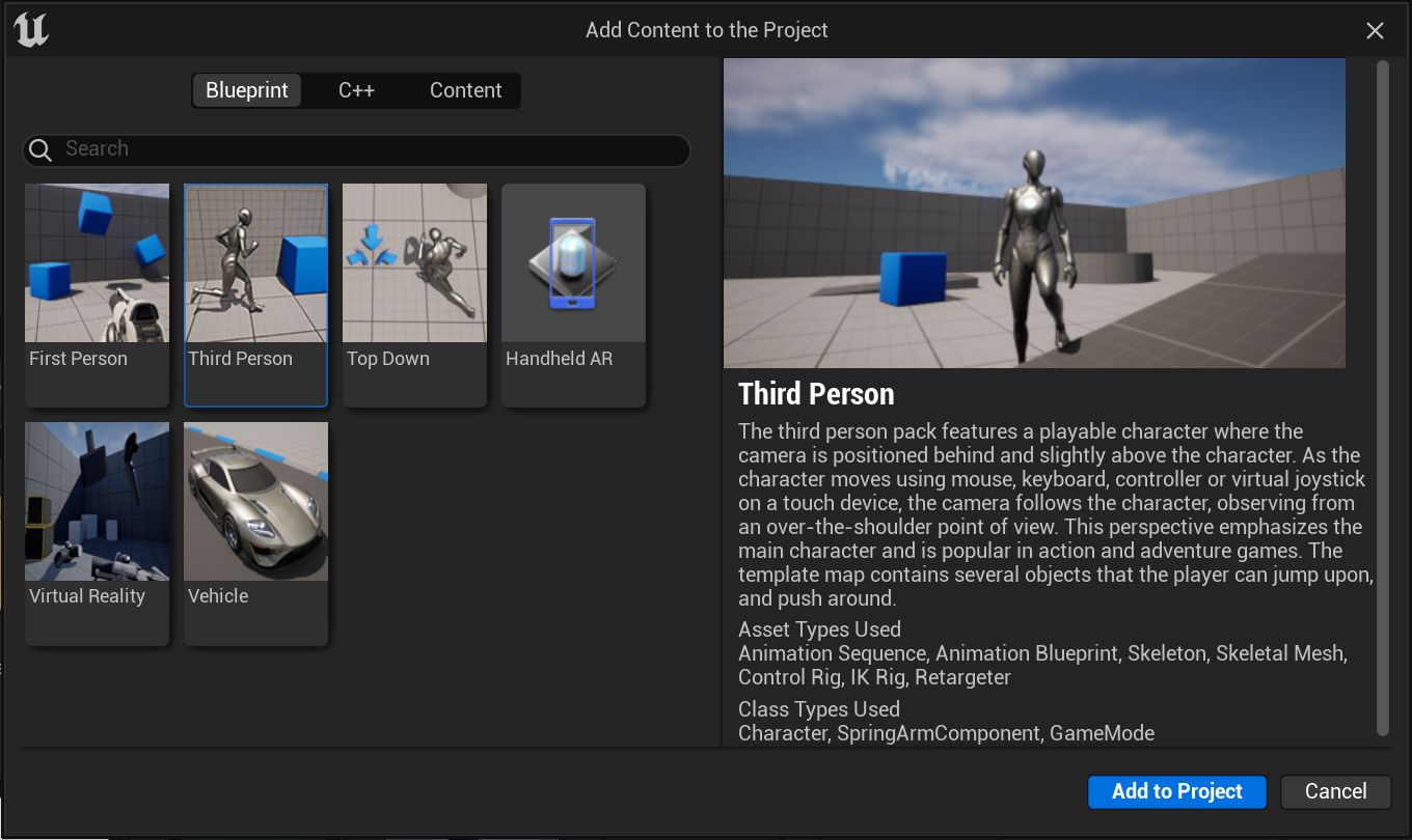 2. Third Person 선택 후 Add to Project를 클릭한다.