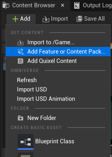1. Content Browser -> +Add -> Add Feater or Content Pack을 선택한다.