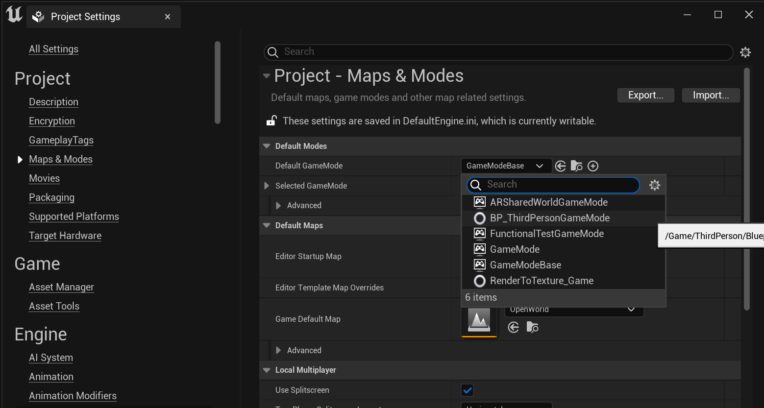Selected GameMode에서 BP_ThirdPersonGameMode로 변경한다.