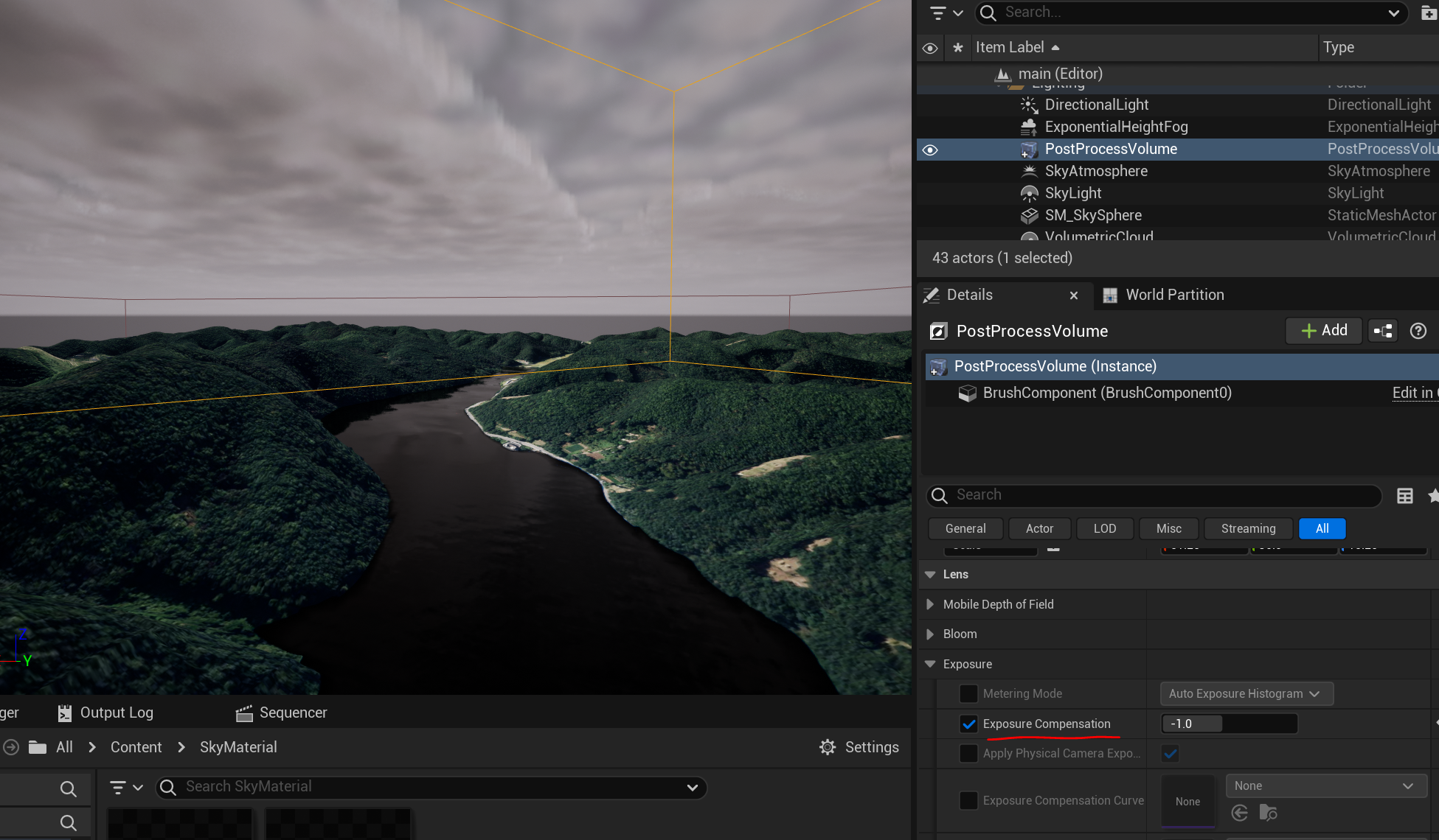16. PostProcessVolume을 선택 후 Details/Exposure/ExposureCompensation을 -1로 줄여준다.