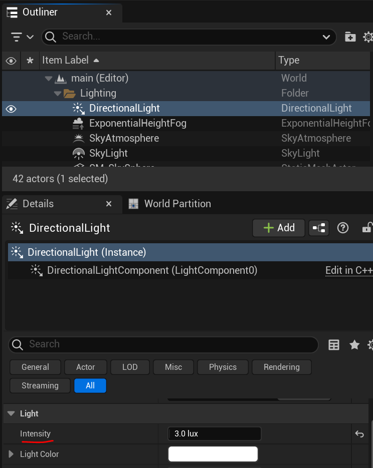 14. DirectionalLight에서 Details/Light/Intensity를 3.0 lux로 낮춰주었다.