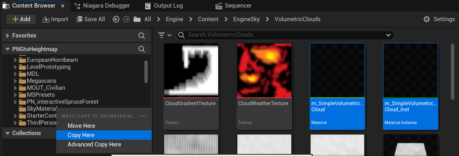 그리고 m_SimpleVolumetricCloud과 m_SimpleVolumetricCloud_Inst를 끌어다가 SkyMaterial로 복사해 준다(Copy Here).