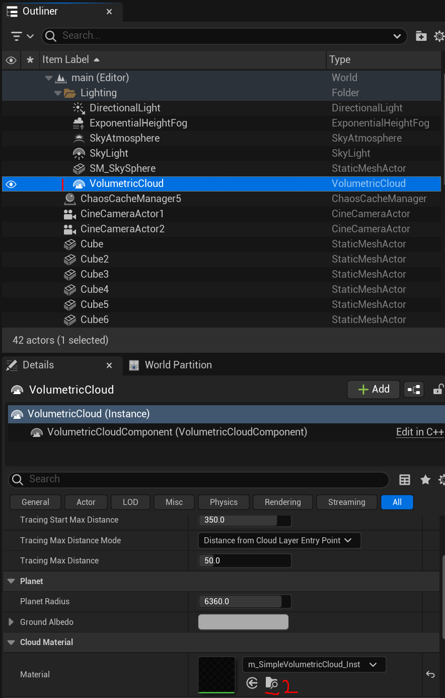 VolumetricCloud/Details/Cloud Material/Material에서 외쪽화살표를 선택해 준다.