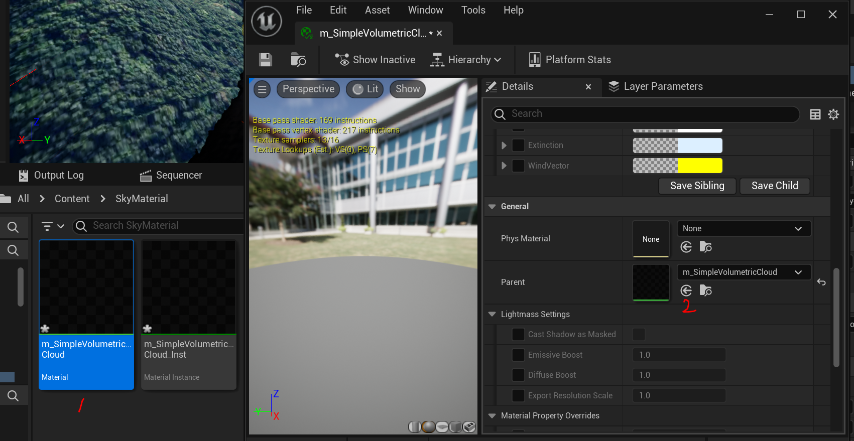 3. SkyMaterial폴더에 있는 m_SimpleVolumetricCloud를 선택한 후 m_SimpleVolumetricCloud_Inst를 더블클릭해서 Details/Genteral/Parent에서 왼쪽 화살표 동그라미를 설정해서 방금 선택한 Material로 바꿔준다.