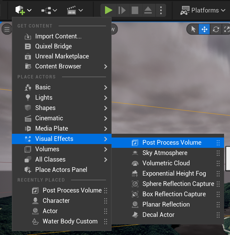 15. 네모상자의 더하기 모양의 아이콘을 선택 후 Visual Effects/Post Process Volume을 선택한다.