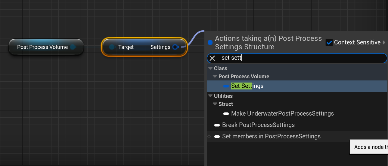 10. Post Process Volume에서 끌어와 Get Settings를 생성한다.