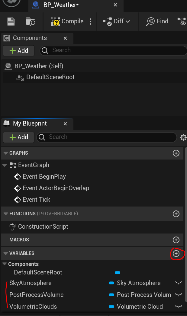3. 새로 생성된 블루프린트의 이름을 BP_Weather로 바꿔준 뒤 BP_Weather을 더블클릭해서 켜준다.
