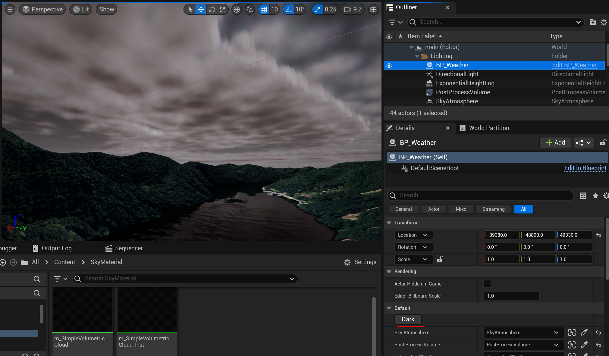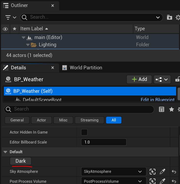 Outliner에서 BP_Weather/Default 밑에 Dark라는 버튼이 생성되었다.
