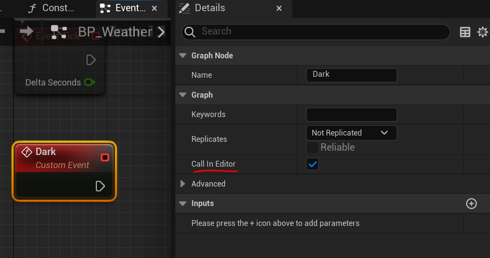 7. Dark로 이름을 바꾼 뒤 Details/Graph/Call In Editor에 체크를 켜준다.