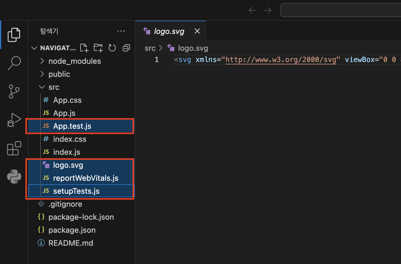 리액트를 설치하면 기본으로 생성되는 폴더들은 앞으로 우리가 개발하는데 필요가 없기 때문에 삭제해 준다.