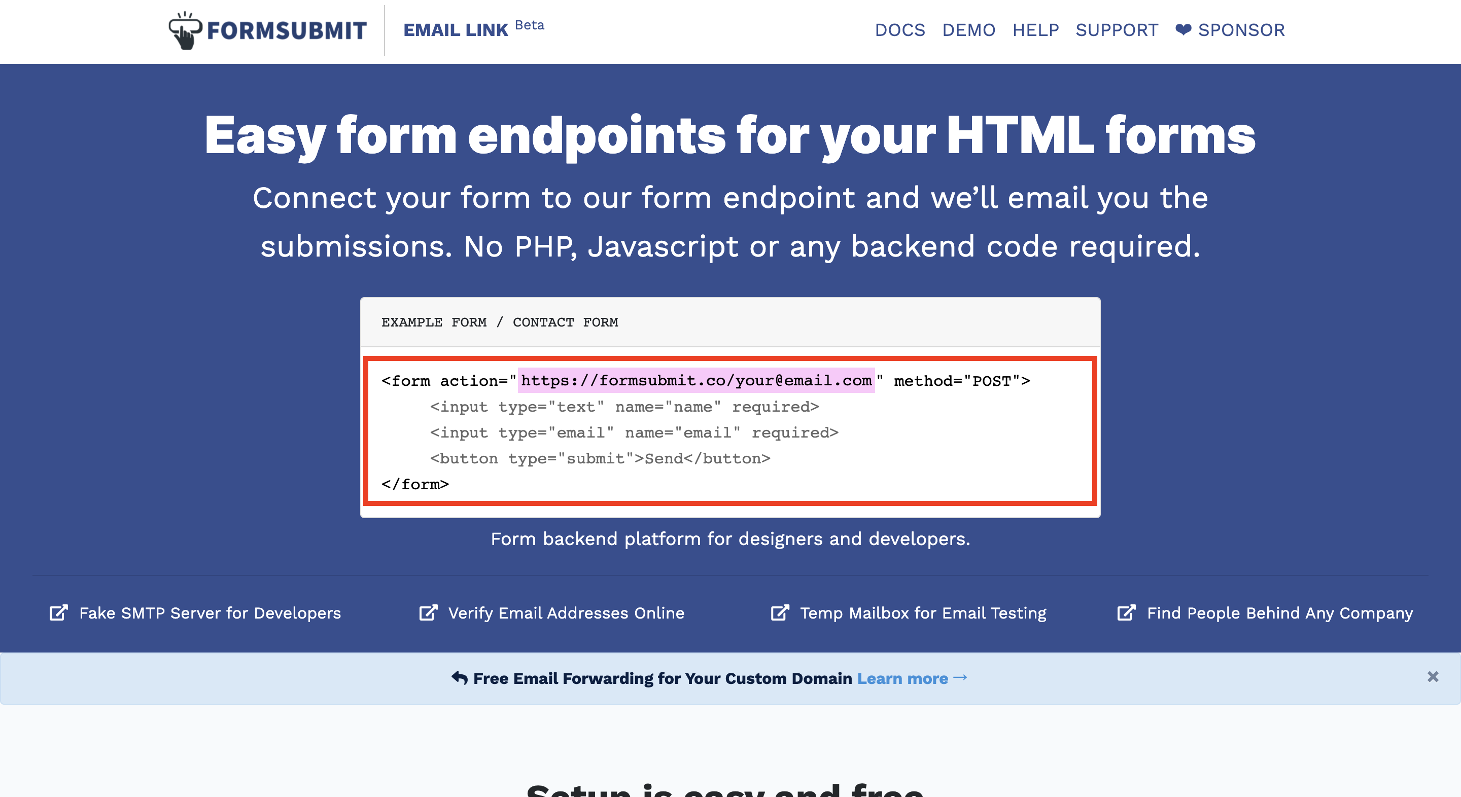 FormSubmit is a form backend, API and email service for HTML forms. It sends your site's form submission directly into your inbox without a need for any backend code or SMTP setup.