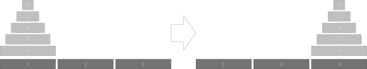 세 개의 장대가 있고 첫 번째 장대에는 반경이 서로 다른 n개의 원판이 쌓여 있다. 각 원판은 반경이 큰 순서대로 쌓여있다. 이제 수도승들이 다음 규칙에 따라 첫 번째 장대에서 세 번째 장대로 옮기려 한다.